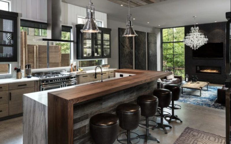 Stilul acestei bucatarii o face sa para foarte solida si puternica , aceasta impresie vine in primul rand din scandura mare a blatului care este partial sustinuta de tevi metalice, iar aceeasi impresie este data de teava mare goala care datorita bunei iluminare Va ofera mai multa claritate.