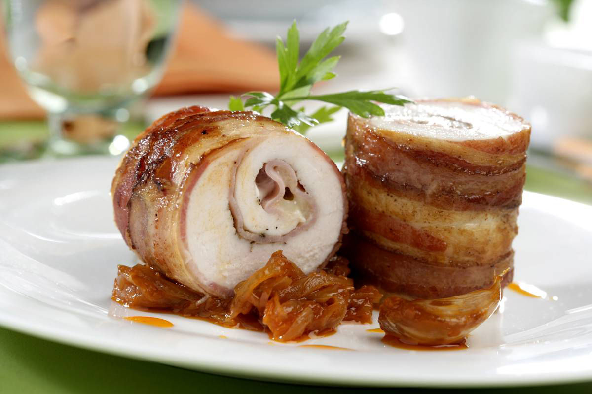 2. Piept umplut si piure de cartofi Pentru aceasta reteta veti avea nevoie de piept de pui dezosat, bacon sau sunca, boia de ardei, branza, cartofi, unt, smantana groasa, sos de prune si sare dupa gust.